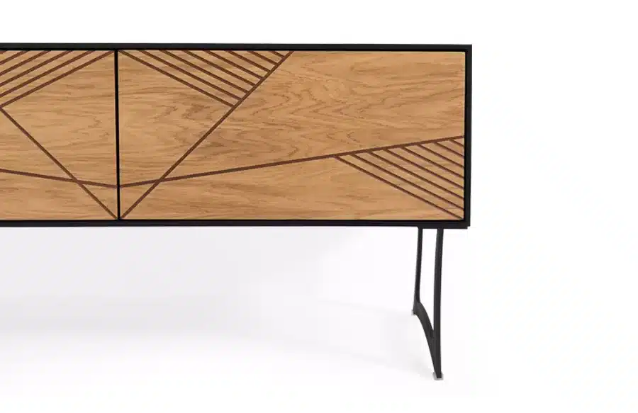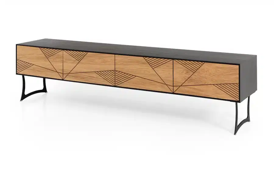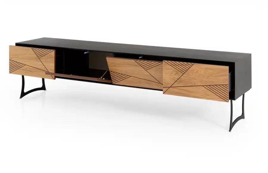 מזנון מעוצב ויוקרתי עם גוף בגוון שחור, דלתות פורמייקה בגוון אלון ופסים שחורים