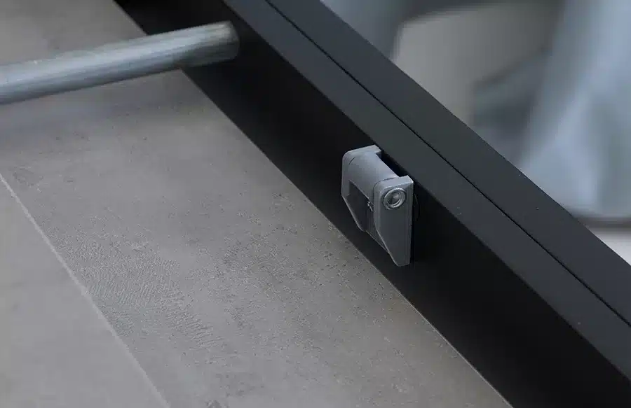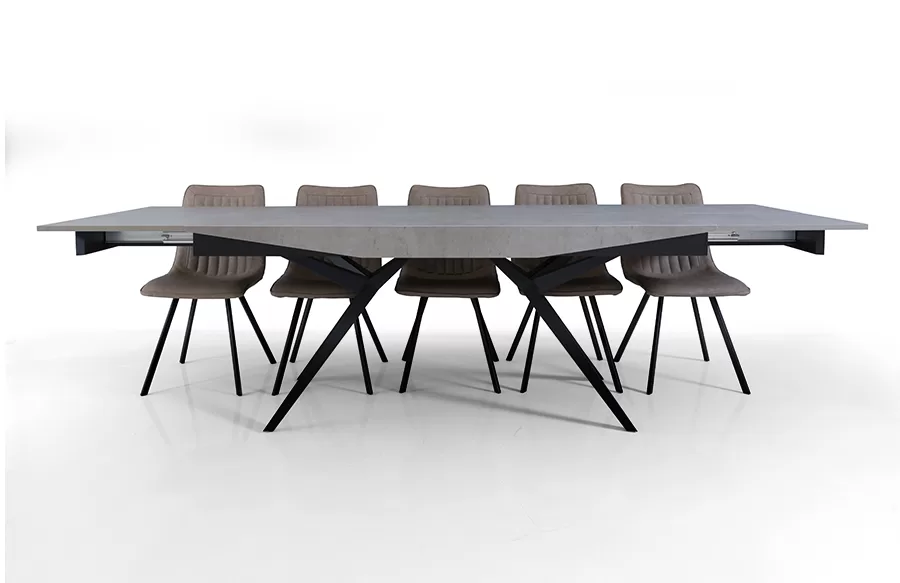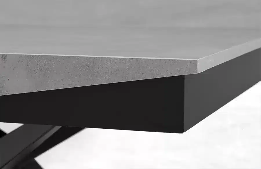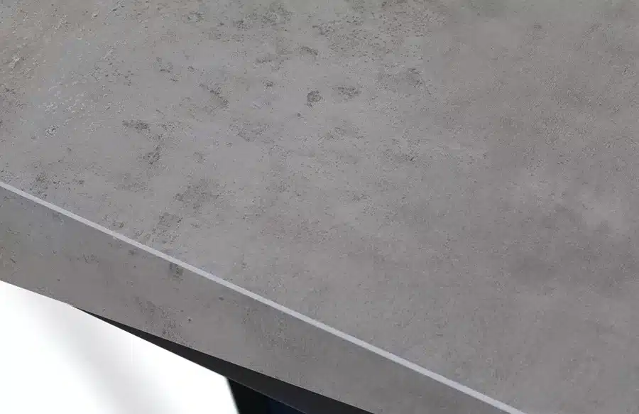 שולחן עם רגל מתכת שחורה ופורמייקה אפורה דמויית בטון.