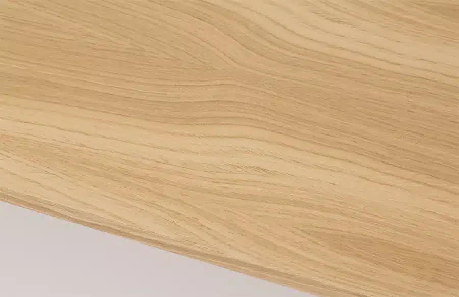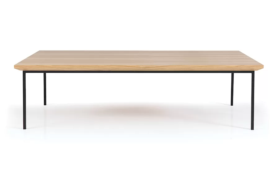 שולחן רחב לסלון בעל רגלי מתכת שחורות ופלטה מעץ אלון טבעי